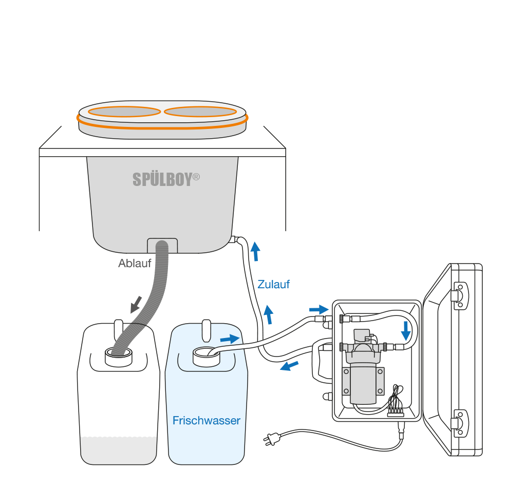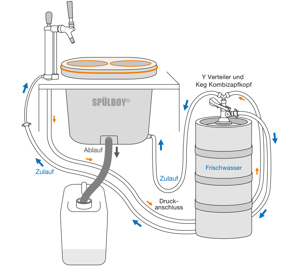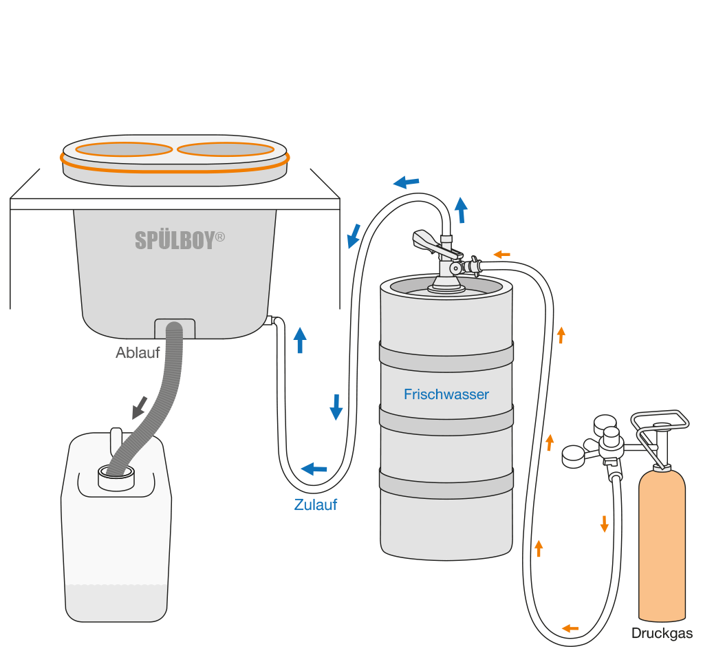 Auch ohne Festwasseranschluss lassen sich SPÜLBOY® Geräte mit unseren Ergänzungssets autark betreiben, z.B. über Kegs mit Druckgas oder durch Elektropumpen mit Frisch- und Abwasserkanistern.