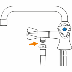 Stellen Sie das Gerät ins Thekenbecken und drehen Sie die Flügelmutter vom Wasserzulaufschlauch auf den passenden Unterspülhahn der Wasserarmatur.