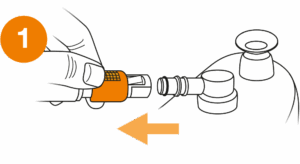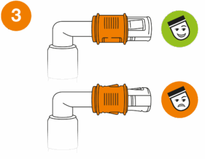 Achten Sie darauf, dass der Dichtring am Zulauf des Gerätes richtig sitzt. Bewegen Sie den Sicherungsschieber (orange) am Anschlussschlauch nach hinten (OFF) und schieben Sie den Anschlussschlauch vollständig über den Geräteanschluss. Schieben Sie nun den orangenen Sicherungsschieber nach vorne, bis Sie ein „clix“ hören. Stellen Sie sicher, dass der Sicherungsschieber am Schlauch nicht verdreht ist.