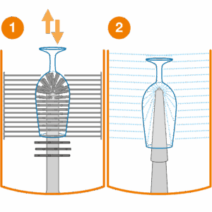 Ganz einfach! Führen Sie das Glas 3-4 mal mit Auf- und Abbewegungen druckvoll über die Bürste, anschließend für 2-3 Sekunden in der Nachspüleinheit klarspülen. Fertig!